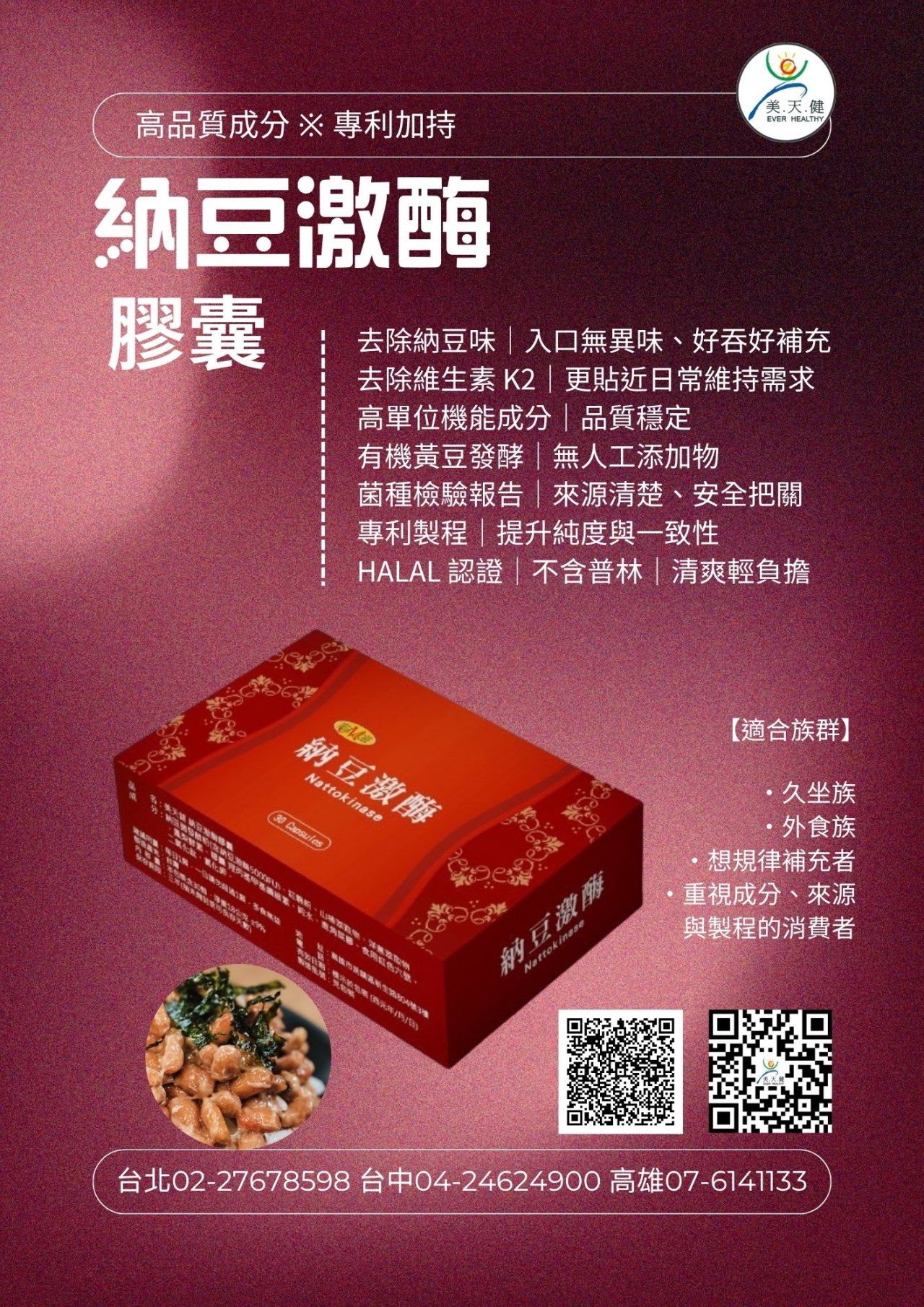 本產品含納豆萃取物(含納豆激酶5000FU),並添加山楂萃取物、洋蔥萃取物、鳳梨酵素等成分,一天1顆,可促進新陳代謝、幫助健康維持。