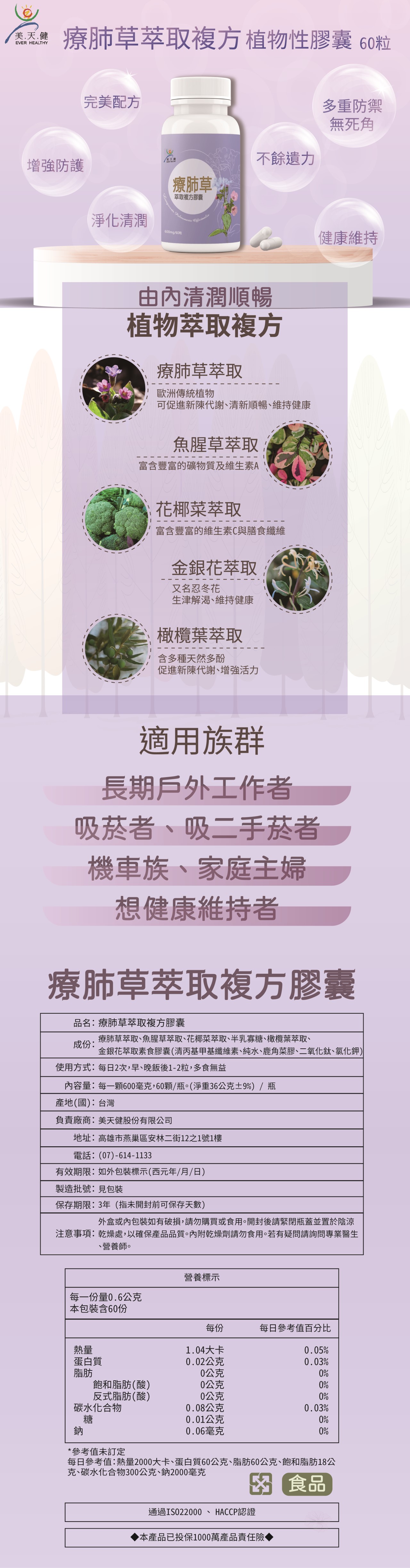 精選療肺草、魚腥草、金銀花、花椰菜、橄欖葉草本植萃成分,讓您清新舒暢,維持健康