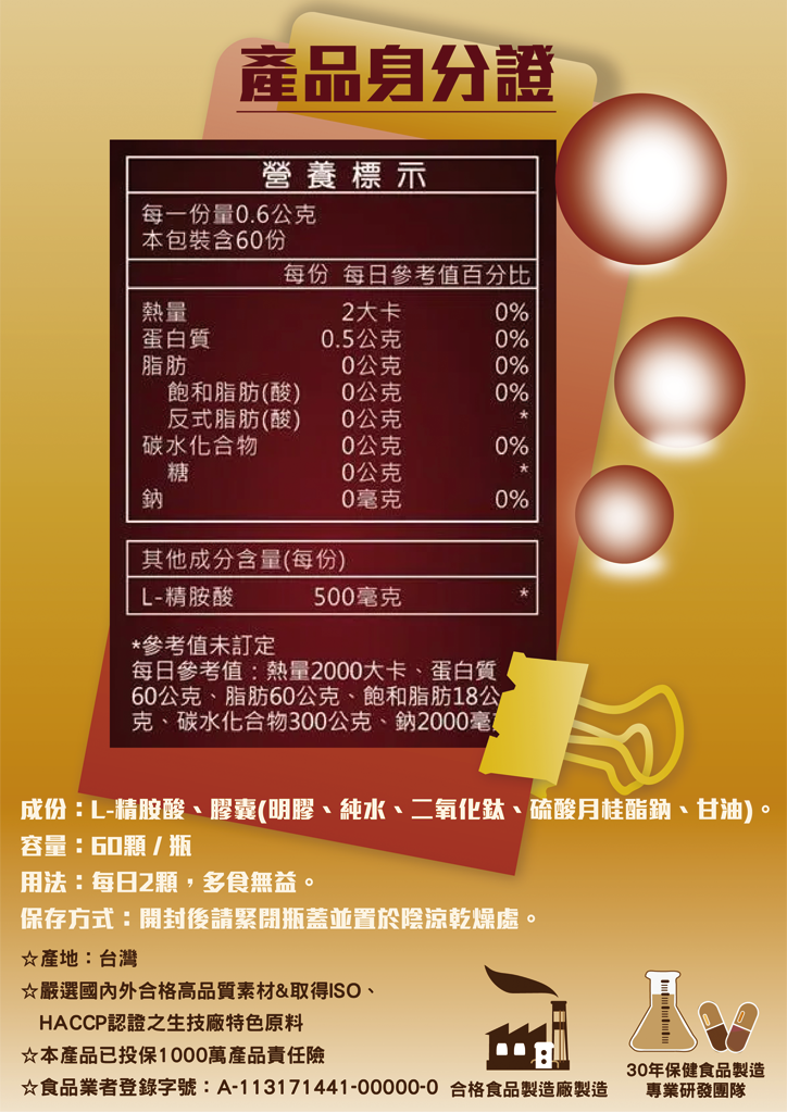 - 每粒含左旋(L型)的游離型態(Free-Form)精胺酸500毫克
